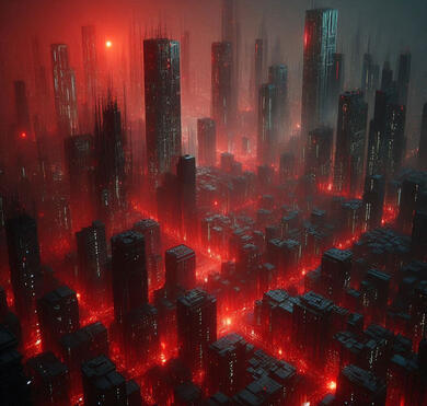 Os prédios são modernos, reluzentes mesmo após décadas de abandono, como se tivessem sido projetados para parecer vivos, mas não estivessem realmente funcionando.Lá sempre é noite. A energia não corre mais pelas estruturas, apenas as luzes das ruas ainda resistem, pulsando num vermelho constante que banha o asfalto molhado.
