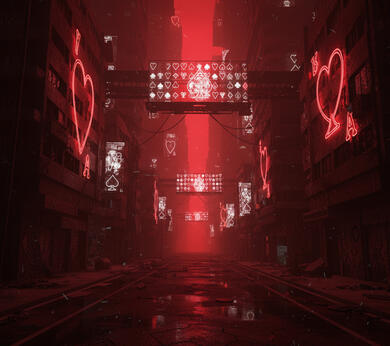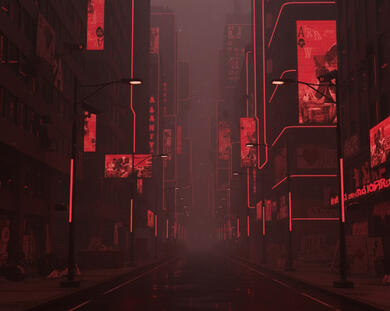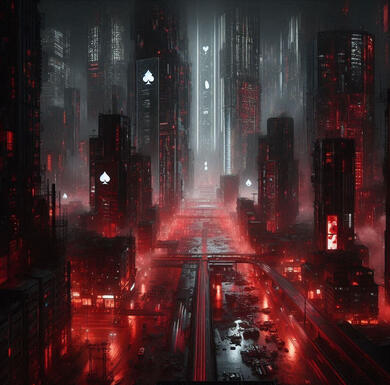 Os prédios são modernos, reluzentes mesmo após décadas de abandono, como se tivessem sido projetados para parecer vivos, mas não estivessem realmente funcionando.Lá sempre é noite. A energia não corre mais pelas estruturas, apenas as luzes das ruas ainda resistem, pulsando num vermelho constante que banha o asfalto molhado.